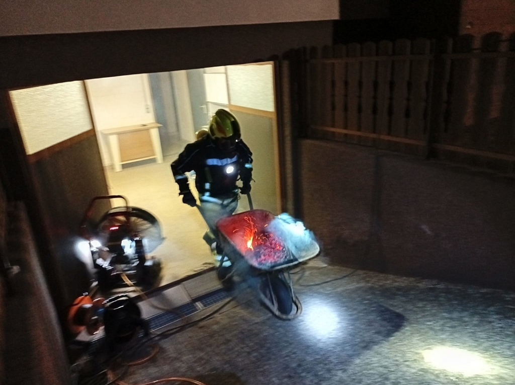 Umgehend rüstete sich ein Atemschutztrupp zur Erkundung und Kontrolle aus, während zeitgleich ein C-Rohr zur Sicherung des Brandschutzes vorbereitet wurde. Um die Sichtverhältnisse zu verbessern und den giftigen Rauch aus dem Gebäude zu leiten, setzten wir zwei Druckbelüfter ein. Ein zweiter Atemschutztrupp kontrollierte parallel den Wohnbereich des Hauses auf eine mögliche Rauchausbreitung. In weiterer Folge wurde der betroffene Ofen händisch ausgeräumt und das heiße Brandgut im Freien endgültig abgelöscht.